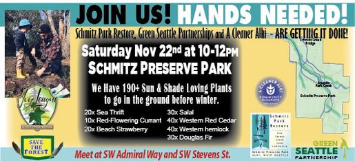 Friends and allies seeking to restore Schmitz Park: Fish, Forest, Creek, Cove, & Community