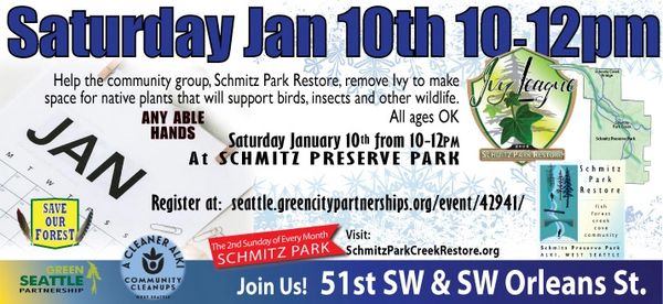 We will review the history of the park, identify the native plants and trees, and learn more about Schmitz Park Restores vision for the future of this beautiful space. This in-person event is a great opportunity to find nature and meet like-minded individuals. Don't miss out on this unique experience to discover the beauty of Schmitz Preserve Park!